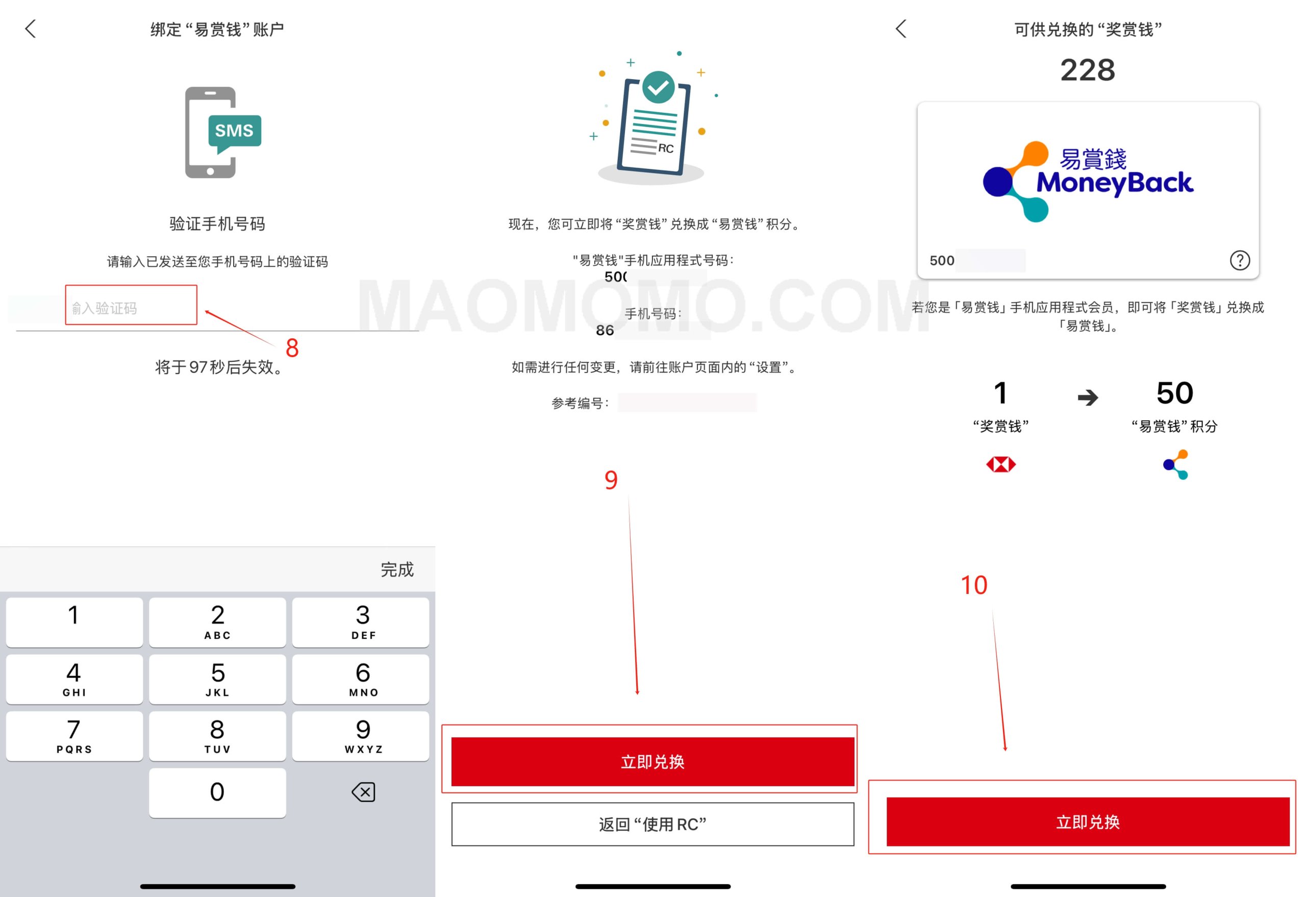 4.然后【Reward+】需要验证你的手机号,输入验证码后绑定【易赏钱】成功,再点击【立即兑换】将RC兑换成易赏钱积分,如下图8-10步: