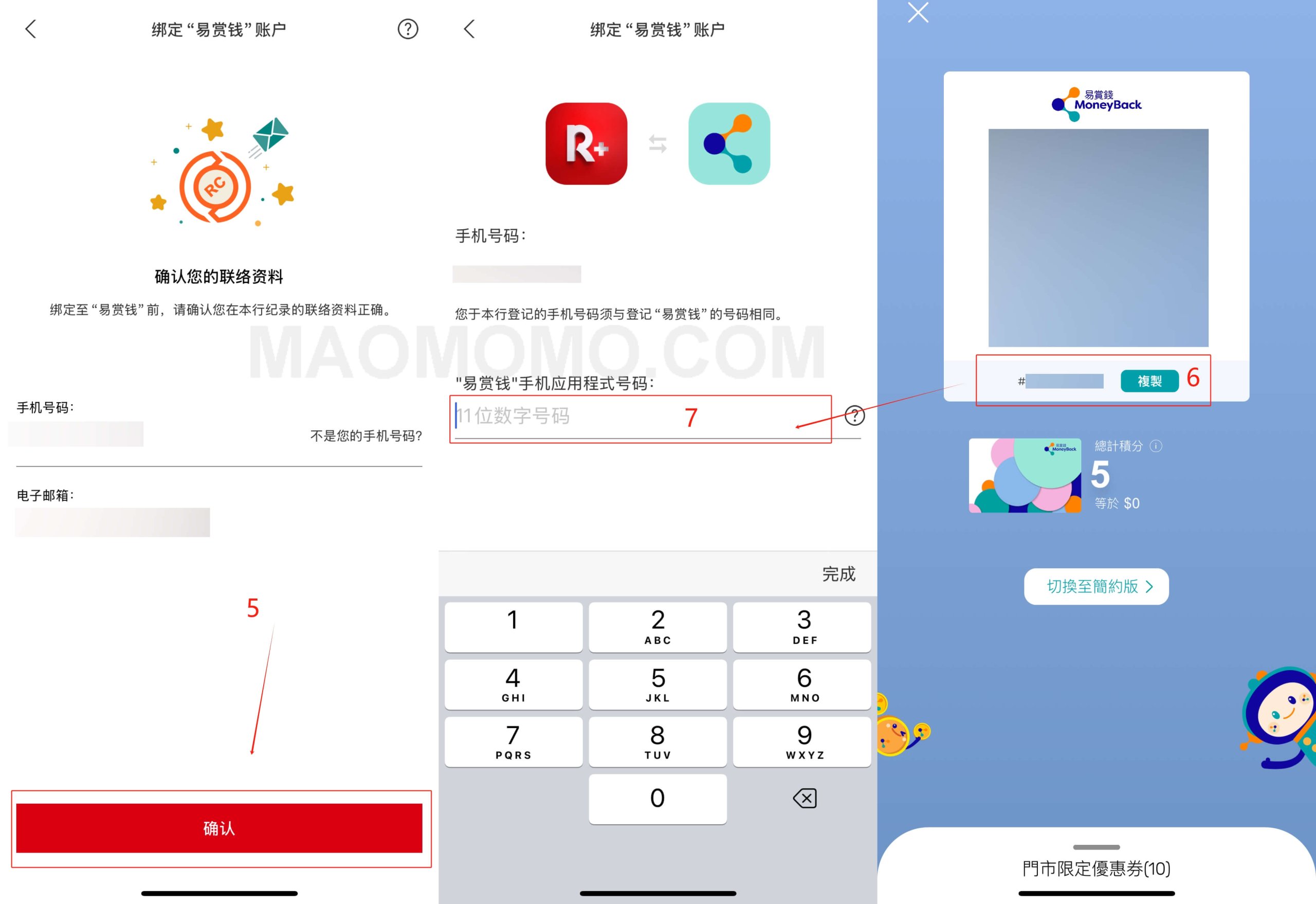 3.确定【Reward+】的手机号和易赏钱【MoneyBack】APP的手机号一致,并且在【MoneyBack】APP复制会员编号粘贴回【Reward+】的输入框,如下图5-7步: