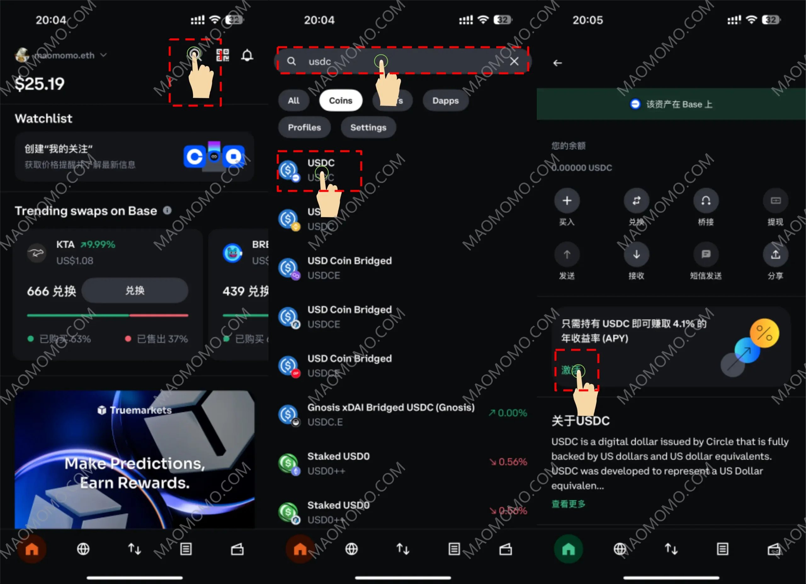 一、如上图所示,点搜索,输入USDC并点击,点激活。