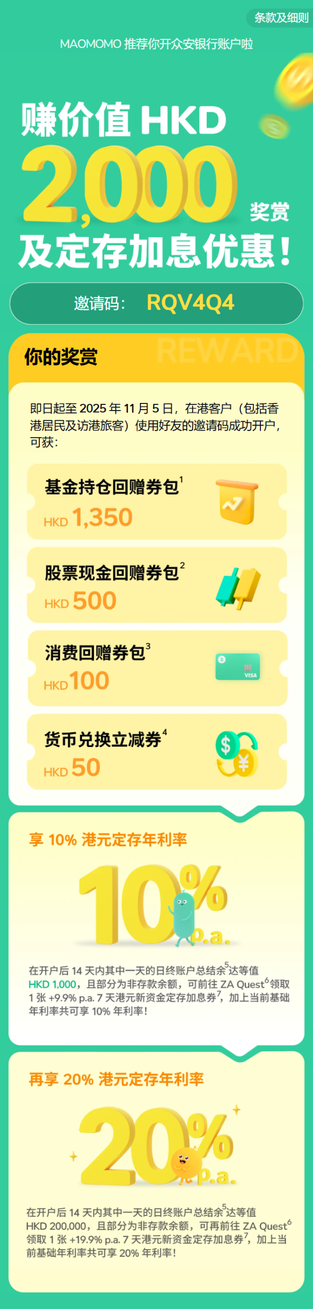 3.如果你还没开通众安银行,欢迎使用我的邀请码【RQV4Q4】进行开户,通过邀请码开户还能获得如下图活动奖励!(具体细则见众安银行的条款细则)