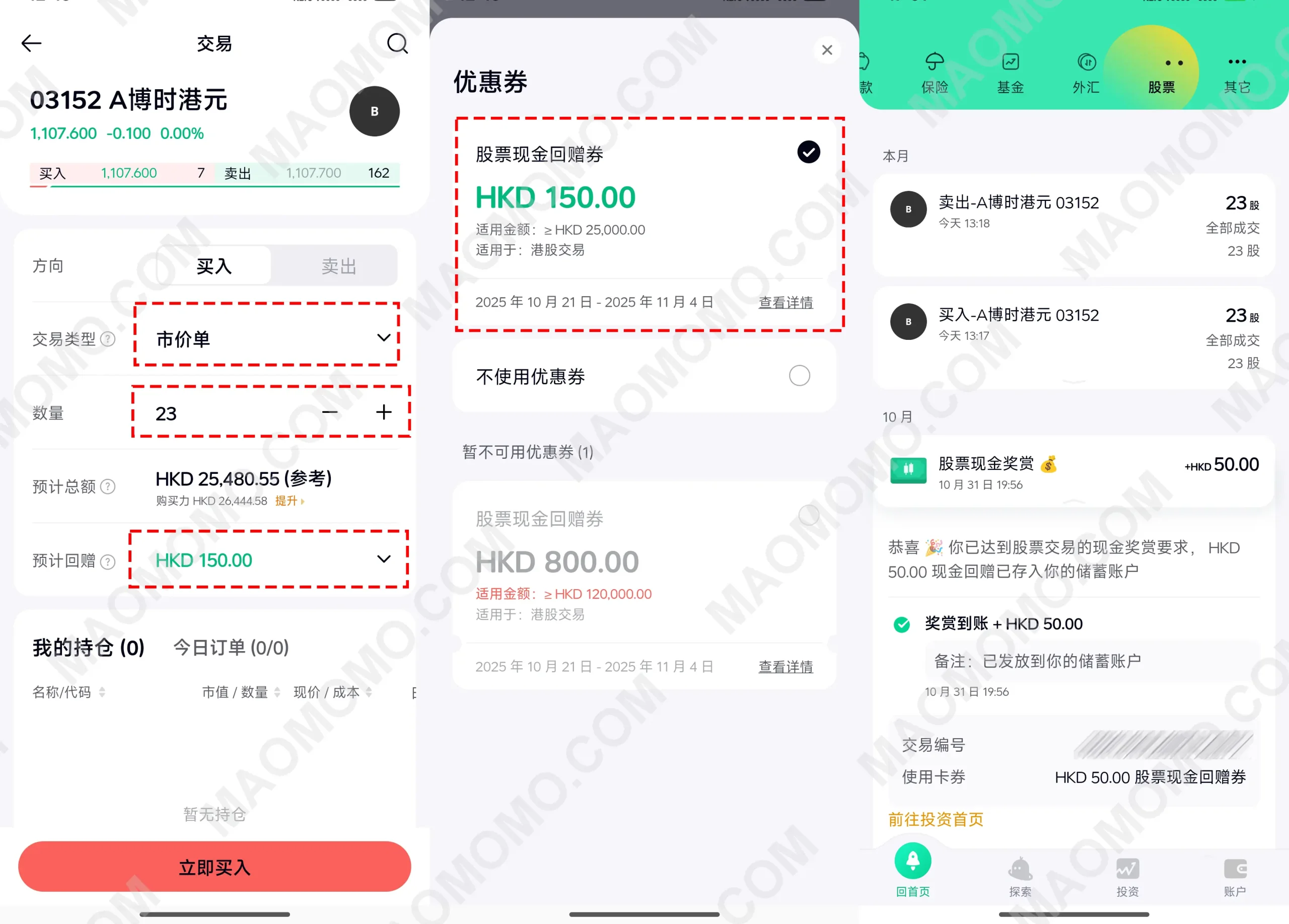 以下用03152(博时港元货币ETF)演示25000返150HKD券: