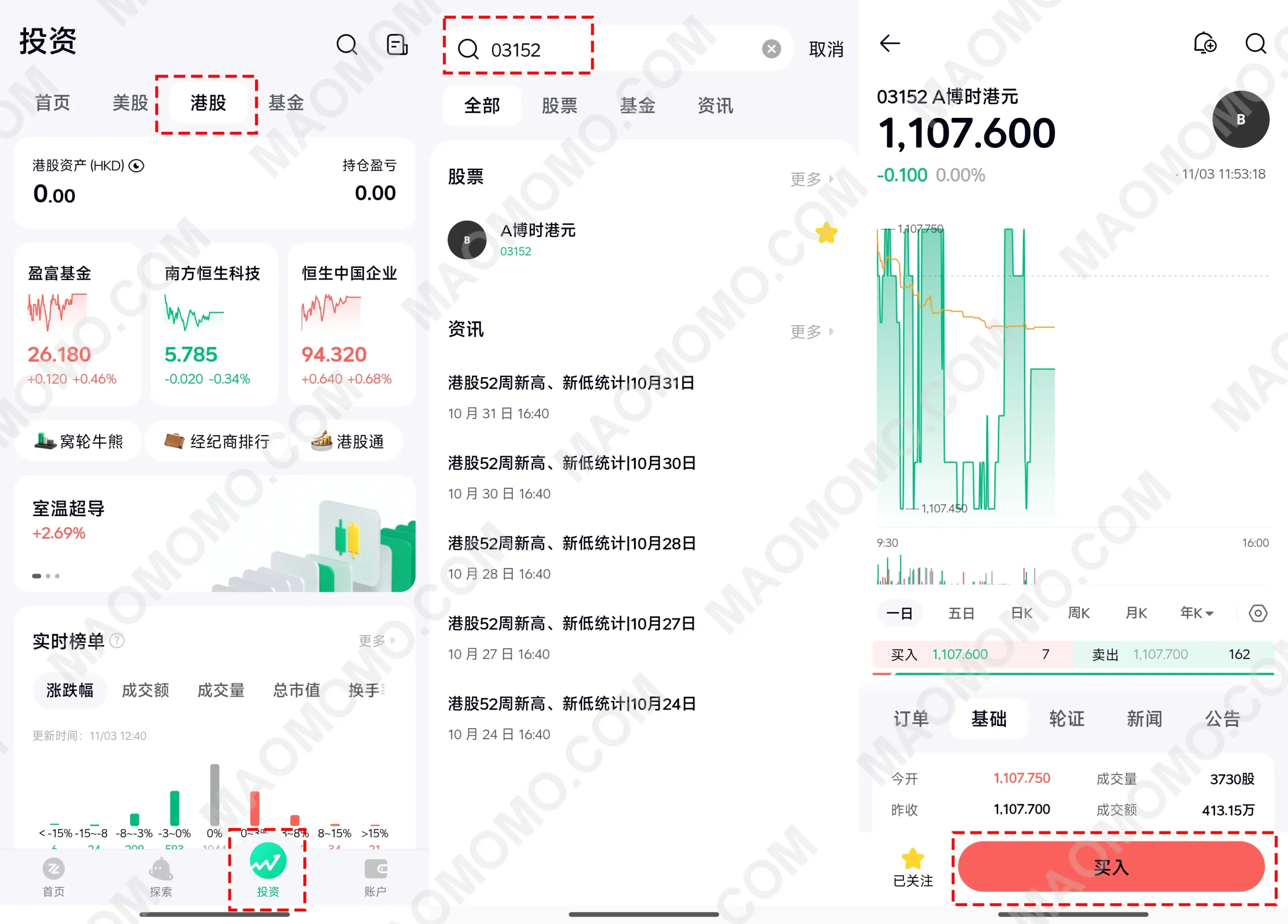 1.如上图所示,依次点击【投资】【港股】【搜索03152】【买入】
