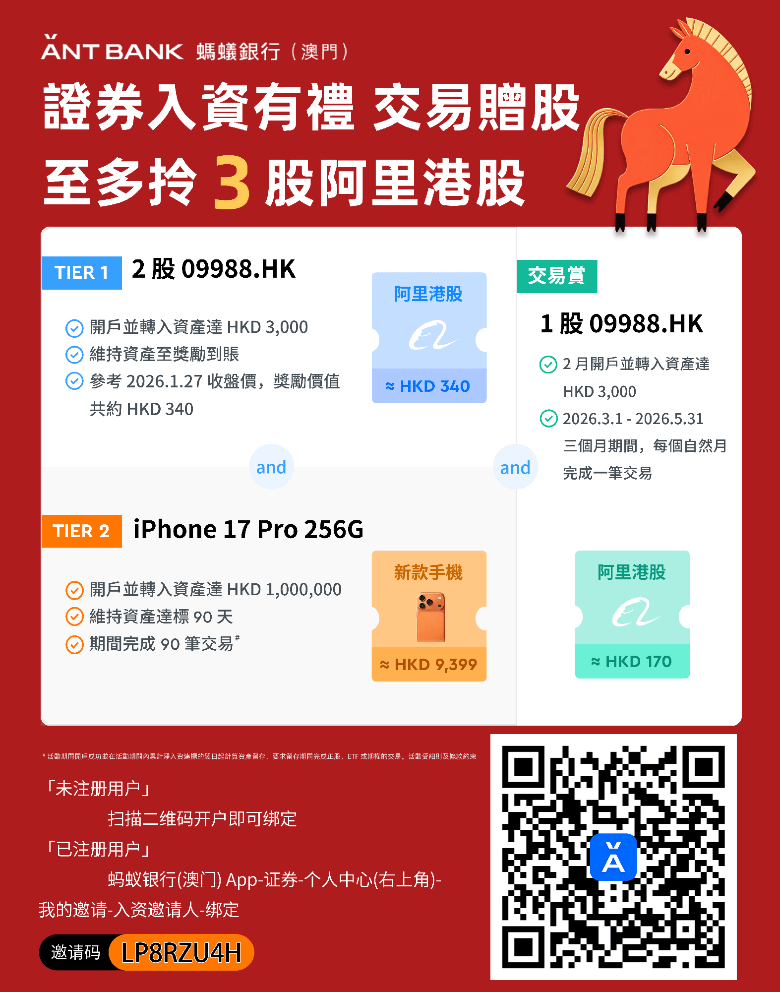 [蚂蚁澳门]新年新客有好礼!600HKD任你拿! By MAOMOMO | 2025年12月31日 0 Comment 蚂蚁澳门专属开户链接: https://render.alipay.com/p/c/180020570000149153/index.html?invite-code=LP8RZU4H 2026年2月1日-28日专属活动奖励获取方式如下: 1.使用上方邀请链接/邀请码注册 2.首次入金达标3000HKD或等值货币,即可获得专属奖励: 福利1️⃣:2股阿里巴巴(大约值340HKD)(入金3000后划转到股票账户直至10个工作日内发放股票卡,请自行点击兑换成股票) 福利2️⃣:免费领取一张澳门通:宋玉生广场诚丰商业中心蚂蚁银行自助柜员机服务点 福利3️⃣:2026年3、4、5每個自然月內各完成至少一次股票交易,可额外获得1股阿里巴巴(大约值170HKD) 3.MAOMOMO加码奖励: 1️⃣:达标上方第【1、2】点后,额外再赠你【HK$100】🧧。 2️⃣:为了方便赠你🧧注册后请填表:https://maomomo.com/antmo-form 注册时务必与我联系确认邀请成功后再入金,否则无法获得相应奖励。 扫下方二维码立即注册:
