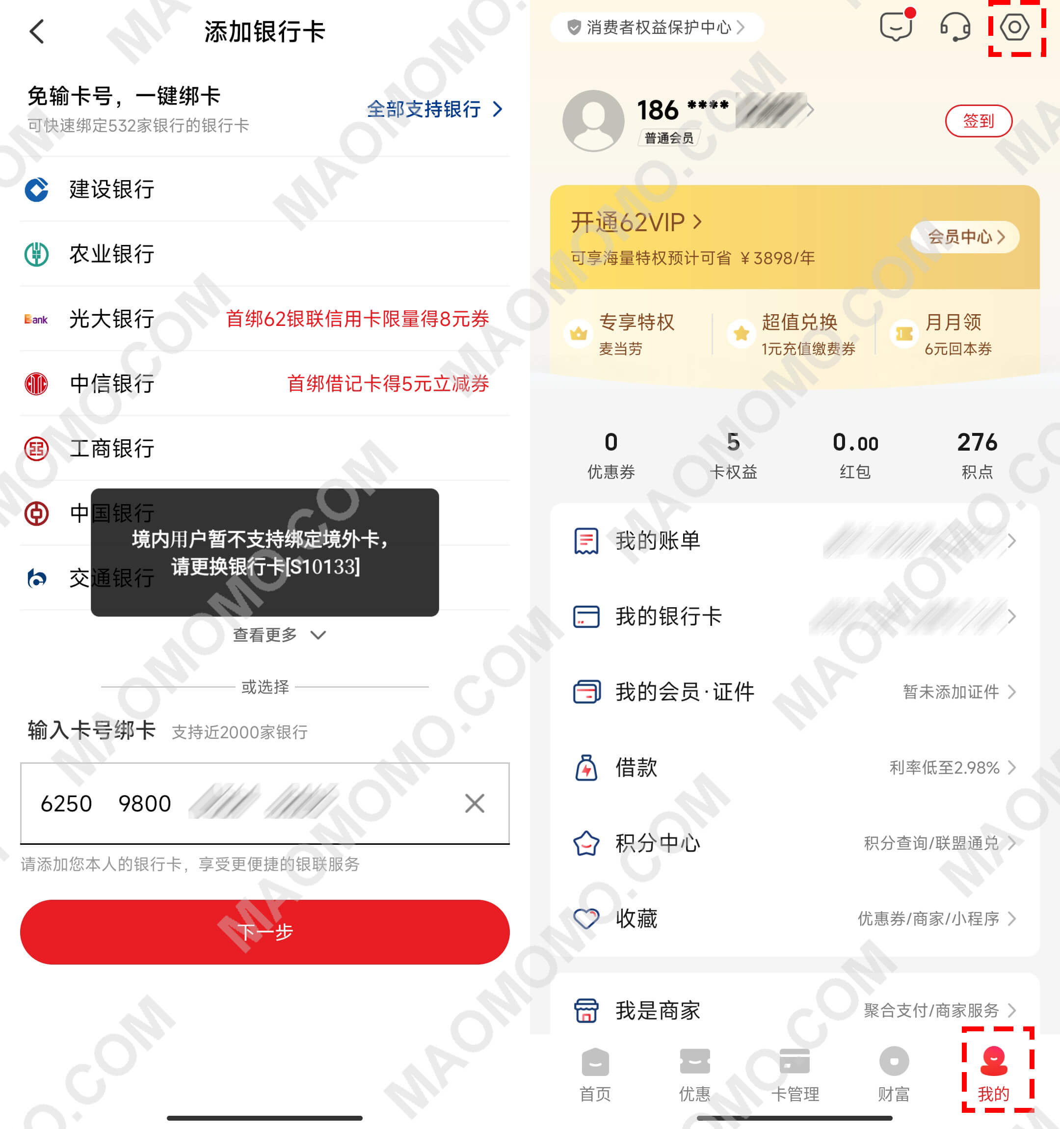 如下图所示,以前注册的云闪付账户可能会提示“境内用户暂不支持绑定境外卡,请更换银行卡[S10133]”。是因为云闪付账户不允许境外银联卡和境内银联卡绑到同一个账户上,所以境内银联卡要把这个坑位让出来。