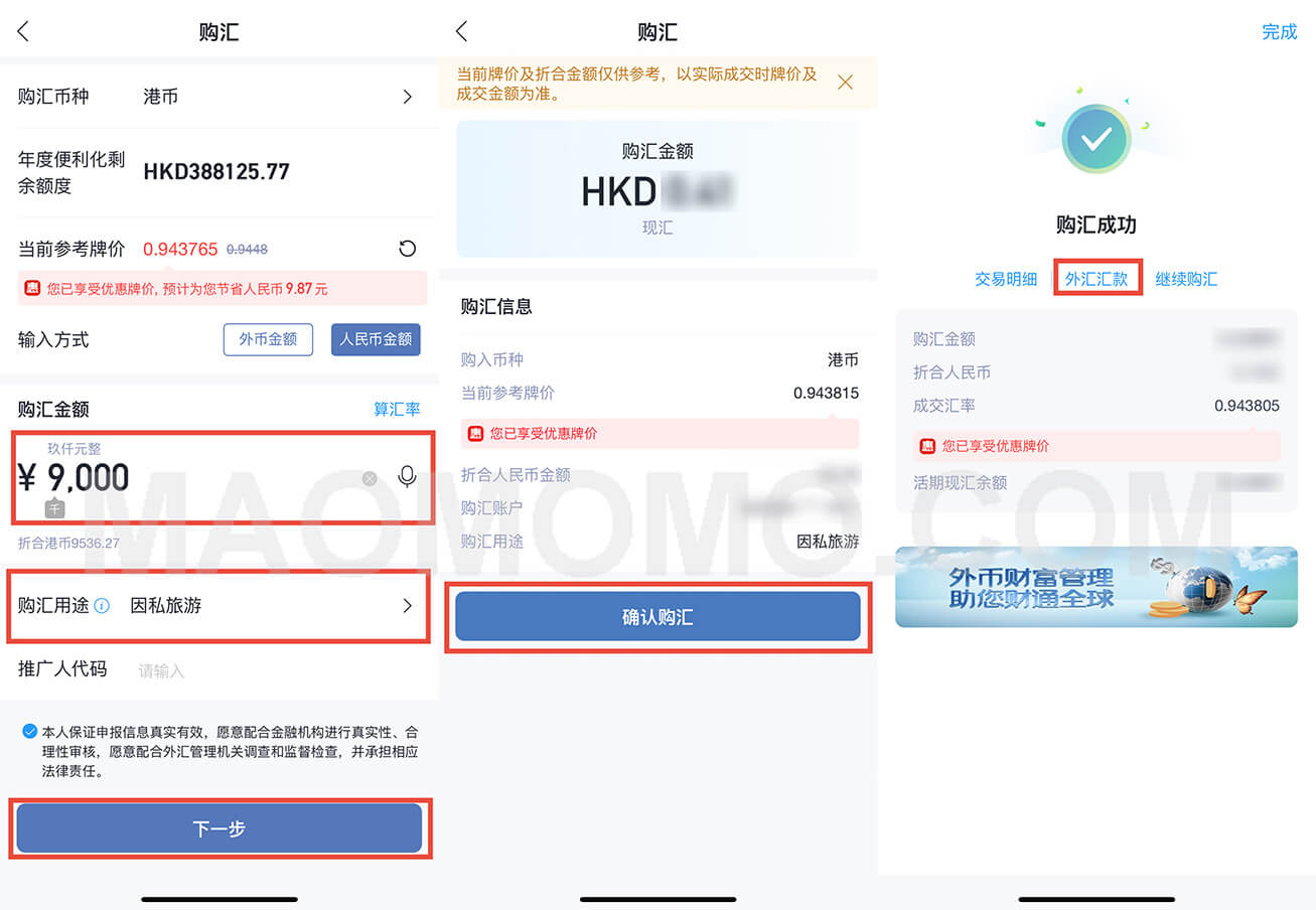 二、输入要购汇的金额,购汇用途通常选择【因私旅游】,再依次点【下一步】【确认购汇】【输入卡密码】就完成购汇了。可以点击【外汇汇款】进入汇款流程。