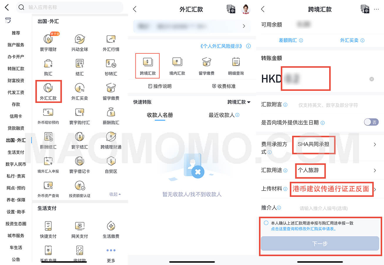 四、然后就是汇款信息了:【汇款人姓名】、【手机号】、【汇款人地址】通常是银行预留的信息,不正确就先改正。然后收款人信息参考上图填入,例如汇丰香港SWIFT代码是【HSBCHKHHHKH】,【收款人英文名】和【收款人账户】在收款银行APP里找一下。然后点下一步。