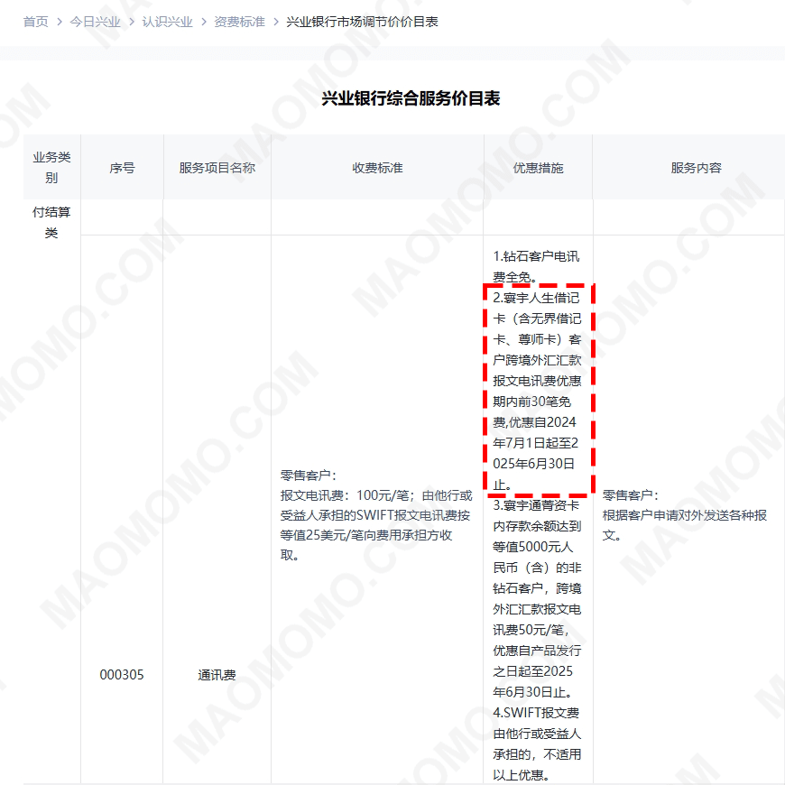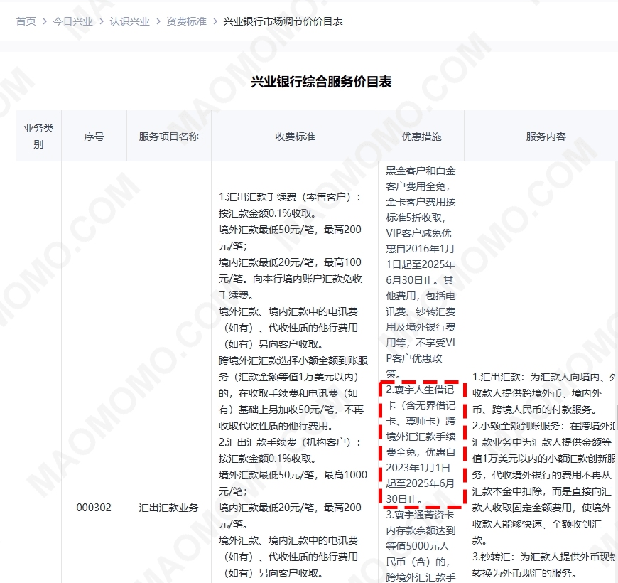 参考兴业官网《兴业银行综合服务价目表》