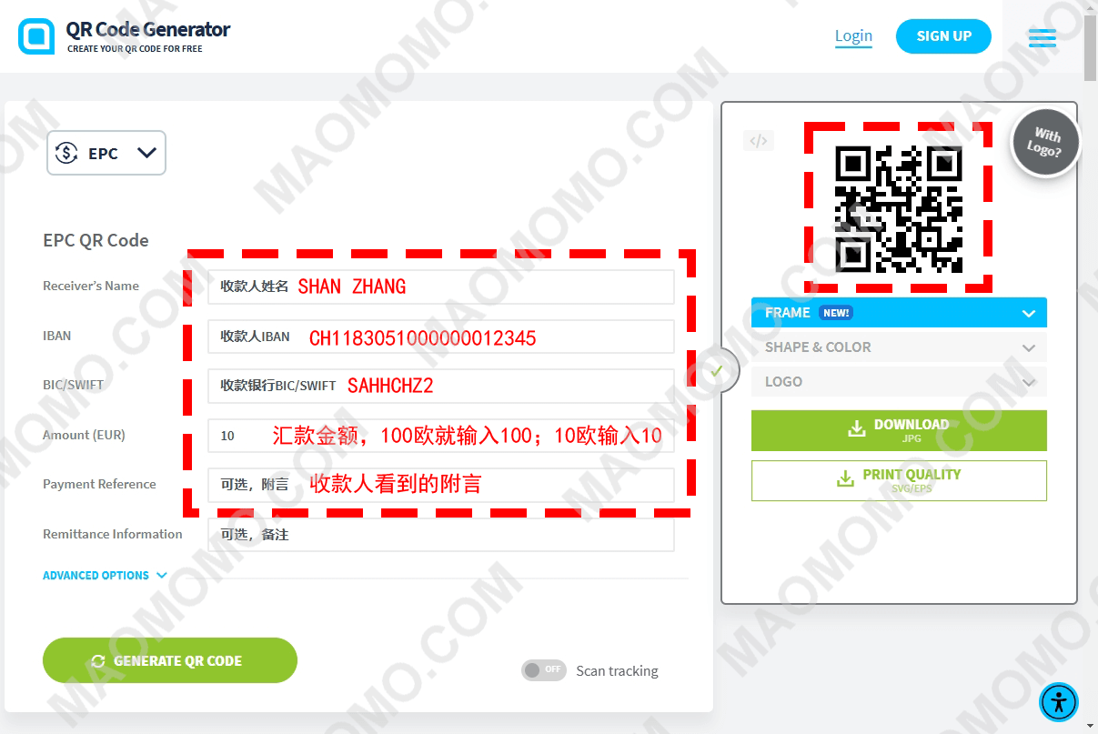 首先去生成一个EPC-QR收款码,可以到:https://www.qr-code-generator.com/solutions/epc-qr-code/这里生成。参考下图填写。